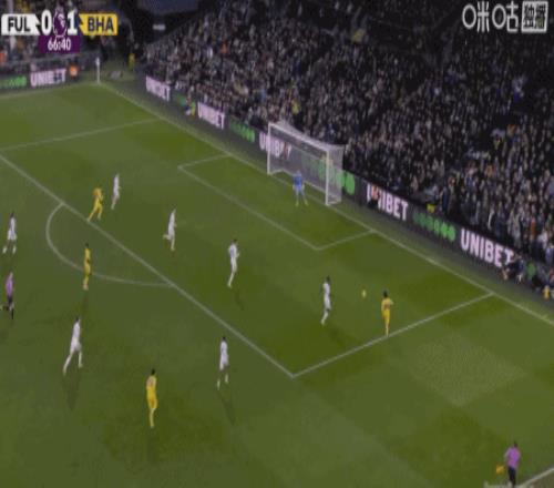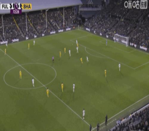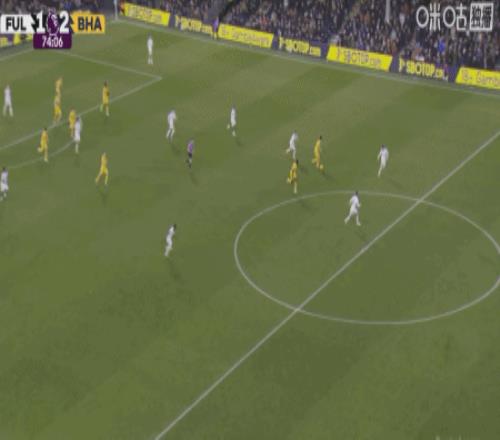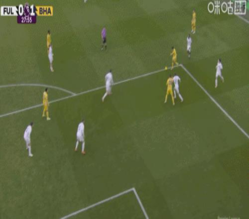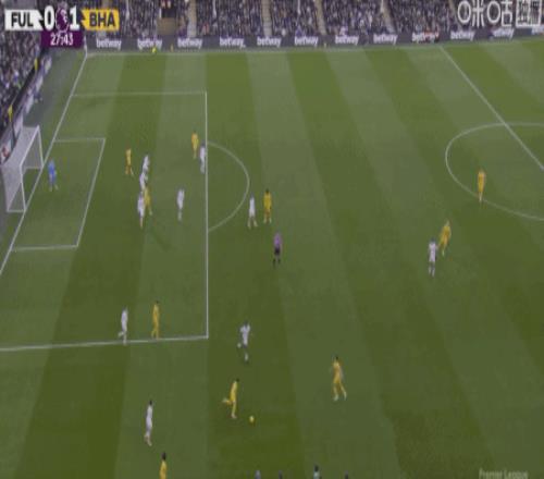 第28分鐘,阿亞里內切勁射破門,布萊頓1-0富勒姆