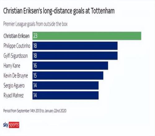 在熱刺的巔峰時期,埃里克森不僅做到了這些,還展現了更多——他堪稱英超聯賽中最出色的創造力源泉。這樣的說法看似大膽,但數據足以佐證:在熱刺效力期間,這位丹麥中場的助攻數和創造機會數均位居聯賽第一,同期禁區外進球數也超過了其他任何英超球員。
